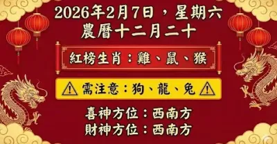 明日生肖運勢~2026年2月7日(星期六) 農曆十二月二十~ 雞、鼠、猴 大吉
